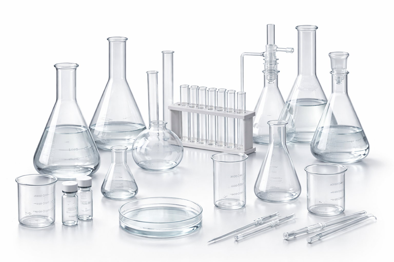 Vidrarias regulares e especiais para laborátorios de pesquisas e exames, mantendo todo o cuidado de manuseio e preparo de embalagens para resistir à jornada de entrega.